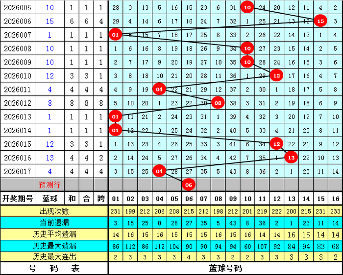 一号球:最近5期分别开出红球:04、07、07、04、01,其中偶数红球出现较少,本期适当关注偶数红球回补,参考号码04。
